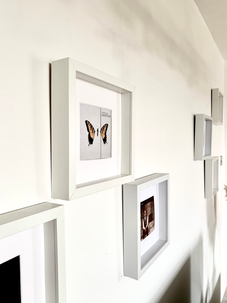 I wanted to put my own spin on it so I didn’t go for the hexagonal shelves – instead I used six or seven white Ikea box prints which had a similar feel. So what to put in them? Well, I chose my favourite album covers.