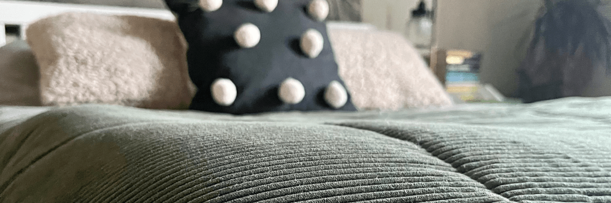 You can bring corduroy into your space in the form of couches, chairs, cushions or even a footrest. It also looks especially nice in jewel tones such as green or blue. For me, I opted for a forest green corduroy throw from Made which finishes off my bedroom nicely.